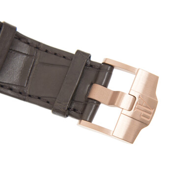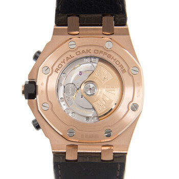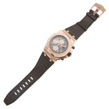 18kt pink gold case with a grey (alligator) leather strap. Fixed 18kt pink gold bezel. Grey ruthenium dial with pink gold hands and Arabic numeral hour markers. Minute markers. Tachymeter markings around the outer rim. Dial Type: Analog. Luminescent hands and markers. Date display at the 3 o'clock position. Chronograph - three sub-dials displaying: 60 second, 30 minute and 12 hour. Audemars Piguet calibre 3126/3840 automatic movement, based upon Audemars Piguet 3120, containing 59 Jewels, composed of 365 parts, bitting at 21600 vph, and has a power reserve of approximately 50 hours. Scratch resistant sapphire crystal. Screw down crown. Transparent case back. Octagon case shape. Case size: 42 mm. Case thickness: 14.6 mm. Tang clasp. Water resistant at 100 meters / 330 feet. Functions: chronograph, tachymeter, date, hour, minute, second. Royal Oak Offshore Series. Luxury watch style. Watch label: Swiss Made. Audemars Piguet Royal Oak Offshore Chronograph Automatic Men's Watch 26470OR.OO.A125CR.01.