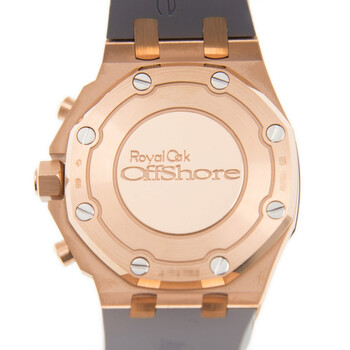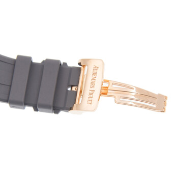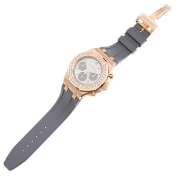 18kt rose gold case with a grey rubber strap. 8 screws fixed 18kt rose gold diamond set bezel. Silver dial with rose gold-tone hands and index hour markers. Minute markers around the outer rim. Dial Type: Analog. Luminescent hands. Date display between 4 and 5 o'clock position. Chronograph - three sub-dials displaying: 60 second, 30 minute and 12 hours. Audemars Piguet Calibre 2385 Automatic movement, containing 37 Jewels, composed of 304 parts, bitting at 21600 vph, and has a power reserve of approximately 40 hours. Scratch resistant sapphire crystal. Screw down crown. Solid case back. Octagon case shape, case size: 37 mm, case thickness: 12.4 mm. Deployment clasp. Water resistant at 50 meters / 165 feet. Functions: chronograph, date, hour, minute, second. Additional Info: bezel with 32 brilliant-cut diamonds (~1.02 carats). Royal Oak Offshore Series. Luxury watch style. Watch label: Swiss Made. Audemars Piguet Royal Oak Offshore Chronograph Automatic Silver Dial Ladies Watch 26231OR.ZZ.D003CA.01.