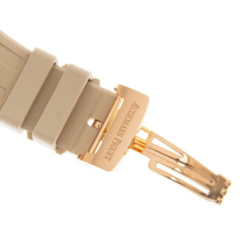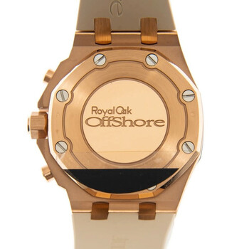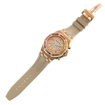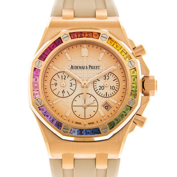 18k rose gold case with a beige rubber strap. 32 rainbow colored sapphires bezel. Rose gold with "lady tapisserie" pattern dial with rose gold-tone hands and index hour markers. Dial Type: Analog. Luminescent hands and markers. Date display between 4 and 5 o'clock position. Chronograph - sub-dials displaying: 12 hours, 30 minutes. Audemars Piguet Calibre 2385 Automatic movement, containing 37 Jewels, composed of 304 parts, bitting at 21600 vph, and has a power reserve of approximately 40 hours. Scratch resistant sapphire crystal. Screw down crown. Octagon case shape, case size: 37 mm, case thickness: 12.4 mm. Folding clasp. Water resistant at 50 meters / 165 feet. Functions: chronograph, date, hour, minute, second. Royal Oak Offshore Series. Luxury watch style. Watch label: Swiss Made. Audemars Piguet Royal Oak Offshore Chronograph Automatic Watch 26236OR.YY.D085CA.01.