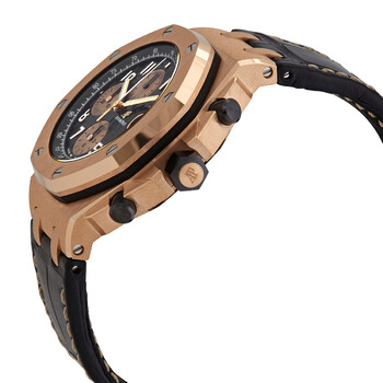 18kt pink gold case with a black (alligator) leather strap. Fixed 18kt pink gold bezel. Black dial with luminous rose gold-tone hands and Arabic numeral hour markers. Minute markers. Tachymeter markers around the outer rim. Dial Type: Analog. Luminescent hands and markers. Date display at the 3 o'clock position. Chronograph - three rose sub-dials displaying: 60 second, 30 minute and 12 hour. Audemars Piguet calibre 3126/3840 automatic movement, based upon Audemars Piguet 3120, containing 59 Jewels, composed of 365 parts, bitting at 21600 vph, and has a power reserve of approximately 50 hours. Scratch resistant sapphire crystal. Screw down crown. Transparent case back. Octagon case shape. Case size: 42 mm. Case thickness: 14.6 mm. Tang clasp. Water resistant at 100 meters / 330 feet. Functions: chronograph, date, hour, minute, small second. Additional Info: original box, international warranty card, manual (complete accessories). Royal Oak Offshore Series. Luxury watch style. Watch label: Swiss Made. Audemars Piguet Royal Oak Offshore Chronograph Black Dial Men's Watch 26470OR.OO.A002CR.02.