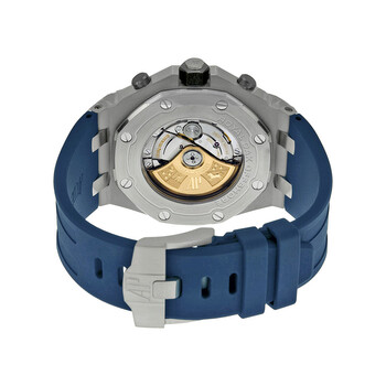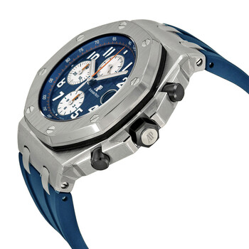 Stainless steel case with a blue rubber strap. Fixed stainless steel bezel. Blue mega tapisserie dial with luminous hands and Arabic numeral hour markers. Tachymeter around the outer rim. Dial Type: Analog. Luminescent hands. Date display appears between the 4 and 5 o'clock position. Chronograph - three sub-dials displaying: 60 second, 30 minute and 12 hour. Audemars Piguet calibre 2385 automatic movement with a 40-hour power reserve. Scratch resistant sapphire crystal. Screw down crown. Solid case back. Case dimensions: 42 mm x 54 mm. Case thickness: 14.5 mm. Octagon case shape. Band width: 20.3 mm. Band length: 8 inches. Tang clasp. Water resistant at 50 meters/ 165 feet. Functions: hours, minutes, seconds, calendar, chronograph. Sport watch style. Watch label: Swiss Made. Item Variations: 26470ST OO A027CA 01, 26470ST-OO-A027CA-01, 26470STOOA027CA01. Audemars Piguet Royal Oak Offshore Blue Dial Chronograph Men's Watch 26470STOOA027CA01.