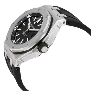 Stainless steel case with a black rubber strap. Fixed stainless steel bezel. Black (waffle pattern) dial with luminous silver-tone hands and index hour markers. Minute markers around the outer rim. Dial Type: Analog. Luminescent hands and markers. Date display at the 3 o'clock position. Audemars Piguet calibre 3120 Automatic movement, containing 40 Jewels, composed of 280 parts, bitting at 21600 vph, and has a power reserve of approximately 60 hours. Scratch resistant sapphire crystal. Screw down crown. Skeleton case back. Octagon case shape. Case size: 42 mm. Case thickness: 14 mm. Tang clasp. Water resistant at 300 meters / 1000 feet. Functions: date, hour, minute, second. Additional Info: Rotating inner bezel. Royal Oak Series. Luxury watch style. Watch label: Swiss Made. Audemars Piguet Royal Oak Offshore Diver Black Dial Black Rubber Men's Watch 15710STOOA002CA01.