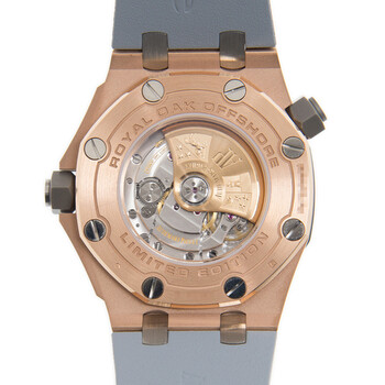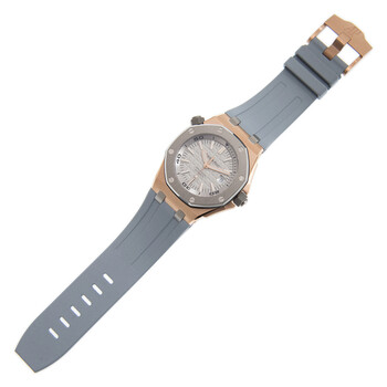 18kt rose gold case with a grey rubber strap. 8 screws fixed grey titanium bezel. Grey dial with rose gold-tone hands and index hour markers. Minute markers around the outer rim. Dial Type: Analog. Luminescent hands and markers. Date display at the 3 o'clock position. Audemars Piguet Calibre 3120 Automatic movement, containing 40 Jewels, composed of 280 parts, bitting at 21600 vph, and has a power reserve of approximately 60 hours. Scratch resistant sapphire crystal. Screw down crown. Transparent case back. Octagon case shape, case size: 42 mm, case thickness: 13.6 mm. Pin buckle clasp. Water resistant at 300 meters / 1000 feet. Functions: date, hour, minute, second. Additional Info: limited edition of 500. Dive watch style. Watch label: Swiss Made. Audemars Piguet Royal Oak Offshore Grey Dial Men's Watch 15711OI.OO.A006CA.01.