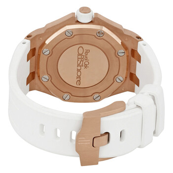 18kt rose gold case with a white rubber strap. 8 screws fixed 18kt rose gold with white rubber edge set with 32 diamonds bezel. Silver (mega-tapestry) dial with rose gold-tone hands and index hour markers. Minute markers around the outer rim. Dial Type: Analog. Date display at the 3 o'clock position. Audemars Piguet Calibre AP 2714 quartz movement. Scratch resistant sapphire crystal. Screw down crown. Solid case back. Octagon case shape, case size: 37 mm x 48 mm, case thickness: 11.10mm. Tang clasp. Water resistant at 50 meters / 165 feet. Functions: date, hour, minute, second. Luxury watch style. Watch label: Swiss Made. Audemars Piguet Royal Oak Offshore Silver Dial Ladies Watch 67540OKZZA010CA01.