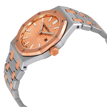 Silver-tone stainless steel case with a two-tone (silver-tone and pink gold-tone) stainless steel and 18kt pink gold bracelet. 8 screws fixed 18kt pink gold bezel. Pink gold dial with silver-tone hands and index hour markers. Dial Type: Analog. Luminescent hands and markers. Date display at the 3 o'clock position. Audemars Piguet Calibre 2713 quartz movement. Scratch resistant sapphire crystal. Solid case back. Octagon case shape, case size: 33 mm, case thickness: 7 mm. Butterfly clasp. Water resistant at 50 meters / 165 feet. Functions: date, hour, minute. Luxury watch style. Watch label: Swiss Made. Audemars Piguet Royal Oak Pink Gold Dial Ladies 18 Carat Pink Gold Watch 67650SR.OO.1261SR.01.