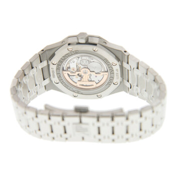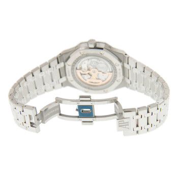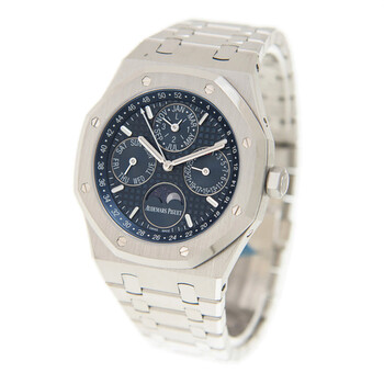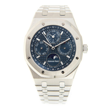 Silver-tone stainless steel case with a silver-tone stainless steel bracelet. 8 screws fixed silver-tone stainless steel bezel. Blue dial with silver-tone hands and index hour markers. Week markers around the outer rim. Dial Type: Analog. Luminescent hands and markers. Perpetual calendar. Four- month, moonphase, date, day of the week subdials. Audemars Piguet Calibre 5134 Automatic movement, based upon Audemars Piguet 2120, containing 38 Jewels, composed of 374 parts, bitting at 19800 vph, and has a power reserve of approximately 40 hours. Scratch resistant sapphire crystal. Screw down crown. Skeleton transparent exhibition see through case back. Octagon case shape, case size: 41 mm, case thickness: 9.5 mm. Deployment with push button release clasp. Water resistant at 200 meters / 660 feet. Functions: perpetual calendar, moon phase, leap year, month, date, day, hour, minute. Luxury watch style. Watch label: Swiss Made. Audemars Piguet Royal Oak Prepetual Calendar Blue Dial Automatic Men's Watch 26574ST.OO.1220ST.02.