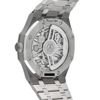 Stainless steel case with a silver-tone stainless steel bracelet. Fixed stainless steel bezel. Transparent dial with index hour markers. Dial Type: Analog. Audemars Piguet Calibre 2972 automatic movement. Scratch resistant sapphire crystal. Screw down crown. Transparent see through case back. Case size: 41 mm, case thickness: 10.6 mm. Deployment clasp. Water resistant at 50 meters / 165 feet. Functions: tourbillon. Additional Info: original box, manual (complete accessories). Royal Oak Series. Luxury watch style. Watch label: Swiss Made. Audemars Piguet Royal Oak Selfwinding Flying Tourbillon Openworked Automatic Men's Watch 26735STOO1320ST02.