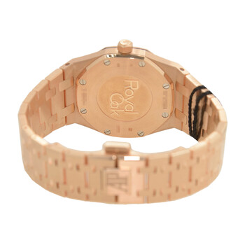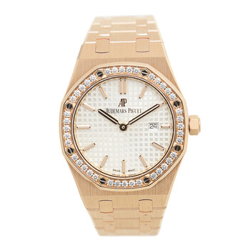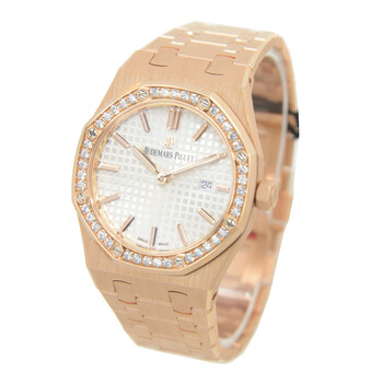 18kt rose gold case with a 18kt rose gold bracelet. 8 screws fixed 18kt rose gold diamond set bezel. Silver dial with gold-toned hands and index hour markers. Dial Type: Analog. Date display at the 3 o'clock position. Audemars Piguet Caliber 2713 quartz movement. Scratch resistant sapphire crystal. Solid case back. Octagon case shape, case size: 42 mm x 33 mm, case thickness: 7 mm. Deployment clasp. Water resistant at 50 meters / 165 feet. Functions: date, hour, minute, second. Luxury watch style. Watch label: Swiss Made. Item Variations: 67651OR ZZ 1261OR 01, 67651OR-ZZ-1261OR-01, 67651ORZZ1261OR01. Audemars Piguet Royal Oak Silver Dial 18kt Rose Gold Ladies Watch 67651ORZZ1261OR01.