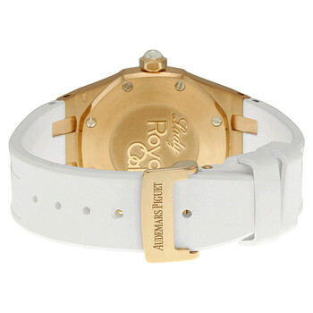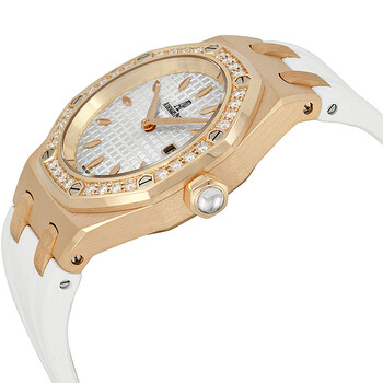 18kt rose gold case with a white rubber strap. 8 screws fixed 18kt rose gold diamond set bezel. Silver dial with rose gold hands and index hour markers. Dial Type: Analog. Date display at the 3 o'clock position. Audemars Piguet Caliber 2713 quartz movement. Scratch resistant sapphire crystal. Pull / push with a translucent sapphire cabochon crown. Solid case back. Octagon case shape, case size: 33 mm, case thickness: 9.2 mm. Band width: 21 mm, band length: 6.5 inches. Deployment clasp. Water resistant at 50 meters / 165 feet. Functions: date, hour, minute. Luxury watch style. Watch label: Swiss Made. Item Variations: 67621OR ZZ D010CA 01, 67621OR-ZZ-D010CA-01, 67621ORZZD010CA01. Audemars Piguet Royal Oak Silver Dial Ladies Watch 67621ORZZD010CA01.