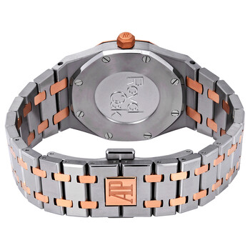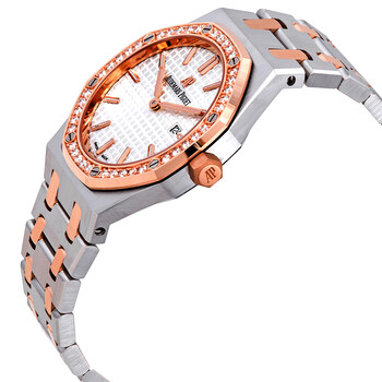Silver-tone stainless steel case with a two-tone (silver-tone and pink gold-tone) stainless steel and 18kt pink gold bracelet. 8 screws fixed 18kt pink gold diamond set bezel. Silver dial with pink gold hands and index hour markers. Dial Type: Analog. Luminescent hands and markers. Date display at the 3 o'clock position. Audemars Piguet Calibre 2713 quartz movement. Scratch resistant sapphire crystal. Solid case back. Octagon case shape, case size: 33 mm, case thickness: 7 mm. Deployment with push button release clasp. Water resistant at 50 meters / 165 feet. Functions: date, hour, minute. Additional Info: bezel set with 40 brilliant-cut diamonds; (~0.73 carats). Luxury watch style. Watch label: Swiss Made. Audemars Piguet Royal Oak Silver Dial Ladies Watch 67651SR.ZZ.1261SR.01.