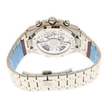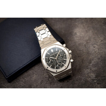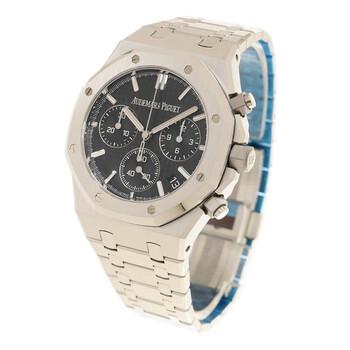 Silver-tone stainless steel case and bracelet. Fixed silver-tone stainless steel bezel. Black dial with silver-tone hands and index hour markers. Minute markers around the outer rim. Dial Type: Analog. Luminescent hands and markers. Date display between 4 and 5 o'clock position. Chronograph - three sub-dials displaying: 60 second, 30 minute and 12 hour. Audemars Piguet Calibre 4401 Automatic movement, containing 40 Jewels, composed of 367 parts, bitting at 28800 vph, and has a power reserve of approximately 70 hours. Scratch resistant sapphire crystal. Transparent see through case back. Octagon case shape, case size: 41 mm. Deployment with push button release clasp. Water resistant at 50 meters / 165 feet. Functions: chronograph, column wheel, flyback, date, hour, minute, second. Additional Info: original box, manual (complete accessories). Royal Oak Series. Luxury watch style. Watch label: Swiss Made. Audemars Piguet Royal Oak Chronograph Automatic Black Dial Men's Watch 26240ST.OO.1320ST.02.