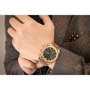 18kt rose gold case with a gold-tone 18kt rose gold bracelet. Fixed gold-tone 18kt rose gold bezel. Black dial with Roman numeral hour markers. Dial Type: Analog. Date display between 4 and 5 o'clock position. Chronograph - three sub-dials displaying: 60 second, 30 minute and 12 hour. Audemars Piguet Calibre 4401 Automatic movement, containing 40 Jewels, composed of 367 parts, bitting at 28800 vph, and has a power reserve of approximately 70 hours. Scratch resistant sapphire crystal. Screw down crown. Transparent see through case back. Case size: 41 mm, case thickness: 12.4 mm. Deployment clasp. Water resistant at 50 meters / 165 feet. Functions: chronograph, hour, minute, second. Additional Info: original box, international warranty card, manual (complete accessories). Royal Oak Series. Luxury watch style. Watch label: Swiss Made. Audemars Piguet Royal Oak"50th Year Anniversary" Chronograph Automatic Black Dial Men's Watch 26240OROO1320OR02.