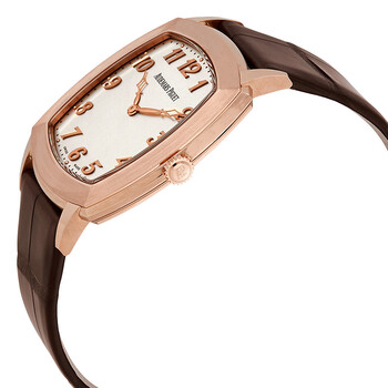 18kt rose gold case with a brown leather strap. Fixed bezel. Silver dial with gold-toned hands and Arabic hour markers. Dial Type: Analog. Automatic movement. Scratch resistant sapphire crystal. Pull / push crown. Case diameter: 41 mm. Cushion case shape. Tang clasp. Water resistant at 20 meters / 66 feet. Functions: hour, minute. Luxury watch style. Watch label: Swiss Made. Audemars Piguet Tradition Silver Dial Brown Leather Men's Watch 15335OROOA092CR01.
