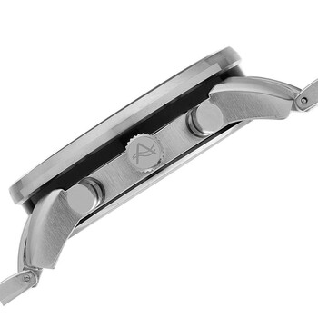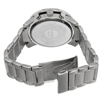 Silver-tone base metal case and bracelet. Base metal silver-tone bezel. Black dial with luminous silver-tone hands and index hour markers. Minute markers. Tachymeter markings around the outer rim. Dial Type: Analog. Luminescent hands and batons. Date display at the 4 o'clock position. Chronograph - two sub-dials displaying: 60 second and 30 minute. Date sub-dial. Quartz movement. Scratch resistant mineral crystal. Pull / push crown. Screw down case back. Round case shape. Case size: 47 mm. Case thickness: 13 mm. Band width: 24 mm. Band length: 8.5 inches. Deployment clasp with a push button release. Water resistant at 10 meters / 33 feet. Functions: chronograph, hour, minute, second. Additional Info: subdials: 30 minute timer, 60 seconds, and date. Casual watch style. Watch label: Chrono Swiss. August Steiner Black Dial Base Metal Men's Watch AS8097SSB.