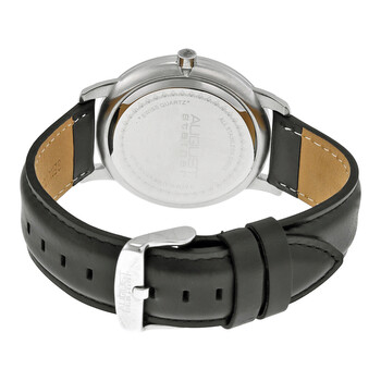 Stainless steel case with a black leather strap. Fixed stainless steel bezel. Black dial with luminous silver-tone hands and alternating Arabic numeral and index hour markers. Dial Type: Analog. Luminescent hands. Date display at the 3 o'clock position. Quartz movement. Scratch resistant mineral crystal. Pull / push crown. Solid case back. Round case shape. Case size: 42 mm. Case thickness: 9 mm. Band width: 20 mm. Band length: 9 inches. Tang clasp. Water resistant at 30 meters / 100 feet. Functions: hour, minute, second. Additional Info: leather strap. Casual watch style. August Steiner Black Dial Black Leather Men's Watch AS8108BKS.
