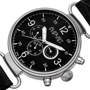 Silver-tone composite metal case with a black leather strap. Fixed silver-tone composite metal bezel. Black dial with silver-tone sword-shaped hands and index hour markers. Arabic numerals appear at the 3, 6, 9 and 12 o'clock positions. Arabic Numeral Minute Markers (at 5 minute intervals). Arabic numeral minute markers (at 5 minute intervals). Minute markers around the outer rim. Dial Type: Analog. Luminescent hands. Date display at the 3 o'clock position. Three multi-function sub-dials displaying: date, day of the week and 24 hour. Quartz movement. Scratch resistant mineral crystal. Pull / push crown. Solid case back. Round case shape. Case size: 45 mm. Case thickness: 13 mm. Band width: 20 mm. Band length: 8.5 inches. Tang clasp. Water resistant at 10 meters / 33 feet. Functions: date, day, GMT, second time zone, hour, minute, second. Fashion watch style. Watch label: Swiss Movt. August Steiner Black Dial Black Leather Men's Watch AS8131SSB.