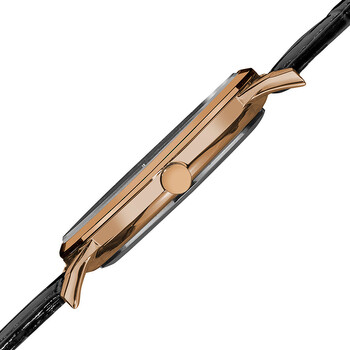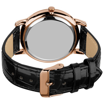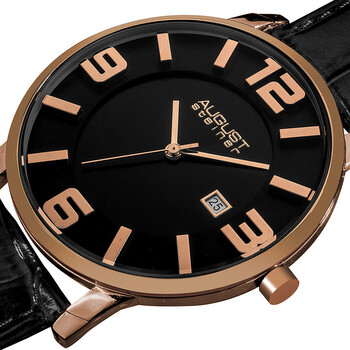 Rose gold-tone metal case with a black leather strap. Fixed rose gold-tone metal bezel. Black dial with rose gold-tone hands and index hour markers. Arabic numerals mark the 3, 6, 9 and 12 o'clock positions. Dial Type: Analog. Date display at the 3 o'clock position. Quartz movement. Scratch resistant mineral crystal. Pull / push crown. Solid case back. Round case shape. Case size: 42 mm. Case thickness: 9 mm. Band width: 20 mm. Band length: 9 inches. Tang clasp. Water resistant at 10 meters / 33 feet. Functions: date, hour, minute, second. Casual watch style. August Steiner Black Dial Rose Gold-tone Metal Black Leather Men's Watch AS8055RG.