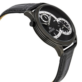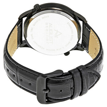 Black ion-plated stainless steel case with a black leather strap. Fixed black ion-plated bezel. Black textured (dual time) dial with luminous silver-tone alpha-style hands. Dial Type: Analog. Luminescent hands. One subdial displaying: small seconds. Quartz movement. Scratch resistant Krysterna crystal. Pull / push crown. Snap down case back. Round case shape. Case size: 41.5 mm. Case thickness: 11 mm. Band width: 22 mm. Band length: 9 inches. Tang clasp. Water resistant at 50 meters / 165 feet. Functions: hour, minute, second. Dual Time Series. Casual watch style. August Steiner Black Dual Time Dial Men's Watch AS8010BK.
