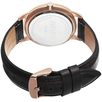 Rose gold-tone stainless steel case with a black leather strap. Fixed rose gold-tone bezel. Black dial with luminous rose gold-tone hands and alternating Arabic numeral and index hour markers. Dial Type: Analog. Luminescent hands. Date display at the 3 o'clock position. Quartz movement. Scratch resistant mineral crystal. Pull / push crown. Solid case back. Round case shape. Case size: 42 mm. Case thickness: 9 mm. Band width: 20 mm. Band length: 9 inches. Tang clasp. Water resistant at 30 meters / 100 feet. Functions: hour, minute, second. Additional Info: leather strap. Casual watch style. August Steiner Black Men's Watch AS8108BKR.