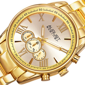 Gold-tone composite metal case with a gold-tone stainless steel bracelet. Fixed gold-tone composite metal bezel. Gold dial with luminous gold-tone pencil-style hands and alternating Roman numeral and index hour markers. Arabic numeral minute markers (at 5 minute intervals). Minute markers around the outer rim. Dial Type: Analog. Luminescent hands. Chronograph - three sub-dials displaying: 60 second, 30 minute and 24 hour. Quartz movement. Scratch resistant mineral crystal. Pull / push crown. Solid case back. Round case shape. Case size: 45 mm. Case thickness: 13 mm. Band width: 24 mm. Band length: 8 inches. Fold over clasp. Water resistant at 10 meters / 33 feet. Functions: chronograph, GMT, hour, minute, second. Fashion watch style. August Steiner Chronograph Quartz Gold Dial Men's Watch AS8163YG.