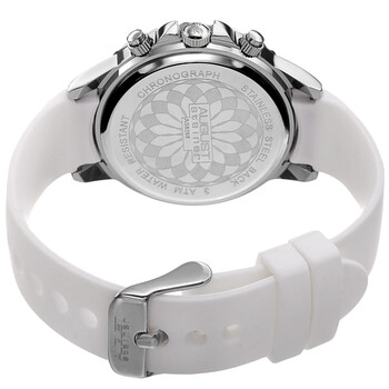 Silver-tone composite metal case with a white silicone strap. Fixed coin edge silver-tone composite metal bezel with a tortoise-shell inlay. White dial with luminous silver-tone hands and index hour markers. Minute markers around the outer rim. Dial Type: Analog. Luminescent hands. Date display between the 4 and 5 o'clock positions. Chronograph - three sub-dials displaying: 60 second, 60 minute and 24 hour. Quartz movement. Scratch resistant mineral crystal. Pull / push crown. Solid case back. Round case shape. Case size: 36 mm. Case thickness: 10 mm. Band width: 15.5 mm. Band length: 7 inches. Tang clasp. Water resistant at 30 meters / 100 feet. Functions: chronograph, date, GMT, second time zone, hour, minute, second. Fashion watch style. August Steiner Chronograph Quartz White Dial Ladies Watch AS8268WT.