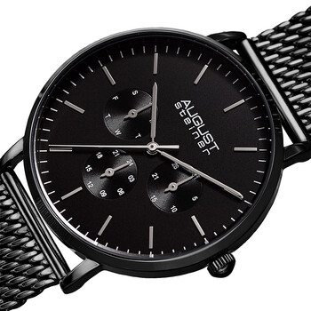 Black alloy case with a black stainless steel mesh bracelet. Fixed black alloy bezel. Black dial with baton style hands hands and index numerals hour markers. Minute markers around the outer rim. Dial Type: Analog. Date display at the 3 o'clock position. Three multi-function sub-dials displaying: date, day of the week, and 24 hours. Quartz movement. Scratch resistant mineral crystal with a hardened coating. Fluted push pull crown. Solid case back. Round case shape. Case size: 40 mm. Case thickness: 8.5mm. Band width: 20mm, band length: 8 inches. Sliding clasp. Water resistant at 30 meters / 100 feet. Functions: date, day, GMT, second time zone, hour, minute, second. Casual watch style. August Steiner Mesh Bracelet Black Dial Men's Watch AS8255BK.