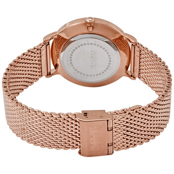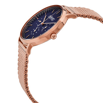 Rose gold-tone alloy case with a rose gold-tone stainless steel mesh bracelet. Rose gold-tone alloy bezel. Blue dial with baton style hands hands and index numerals hour markers. Minute markers around the outer rim. Dial Type: Analog. Date display at the 3 o'clock position. Three multi-function sub-dials displaying: date, day of the week, and 24 hours. Quartz movement. Scratch resistant mineral crystal with hardened coating. Fluted push pull crown. Solid case back. Round case shape. Case size: 40 mm. Case thickness: 8.5mm. Band width: 20mm. Band length: 8 inches. Fold over slip through clasp. Water resistant at 30 meters / 100 feet. Functions: date, day, GMT, second time zone, hour, minute, second. Casual watch style. August Steiner Mesh Bracelet Blue Dial Men's Watch AS8255RGBU.