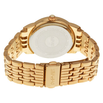 Rose gold-tone base metal case and bracelet. Fixed rose gold-tone base metal bezel set with crystals. White mother of pearl dial with luminous rose gold-tone hands and diamond hour markers. Minute markers around the outer rim. Dial Type: Analog. Quartz movement. Scratch resistant mineral crystal. Pull / push crown. Screw down case back. Round case shape. Case size: 35 mm. Case thickness: 8 mm. Band width: 15.75 mm. Band length: 7.5 inches. Deployment clasp with a push button release. Water resistant at 10 meters / 33 feet. Functions: hour, minute, second. Dress watch style. Watch label: Swiss Quartz. August Steiner Mother of Pearl Dial Rose Gold-tone Ladies Watch AS8045RG.