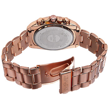 Rose gold-tone base metal case with a rose gold-tone base metal bracelet. Fixed rose gold-tone base metal bezel. Brown dial with luminous rose gold-tone hands and alternating Arabic numeral and index hour markers. Arabic numeral minute markers (at 5 minute intervals). Minute markers around the outer rim. Dial Type: Analog. Luminescent hands and batons. Date display at the 3 o'clock position. Three multi-function sub-dials displaying: month, day of the week and 24 hour. Quartz movement. Scratch resistant mineral crystal. Pull / push crown. Solid case back. Round case shape. Case size: 43 mm. Case thickness: 13 mm. Band width: 22 mm. Band length: 9 inches. Fold over clasp with a double push button release. Water resistant at 10 meters / 33 feet. Functions: month, date, day, GMT, second time zone, hour, minute, second. Additional Info: month, day and GMT. Casual watch style. Watch label: Swiss Quartz. August Steiner Multi-Function Brown Dial Men's Watch AS8109RG.