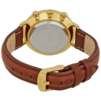 Gold-tone alloy case with a brown leather strap. Fixed gold-tone alloy bezel. Silver dial with gold-tone hands and index hour markers. Stylized Roman numerals mark the 3, 6, 9 and 12 o'clock positions. Minute markers around the outer rim. Dial Type: Analog. Date display at the 3 o'clock position. Three multi-function sub-dials displaying: day of the week, month, and 24 hours. Quartz movement. Scratch resistant sapphire-coated mineral crystal. Pull / push crown. Solid case back. Round case shape. Case size: 38 mm. Case thickness: 10 mm. Band width: 16 mm. Tang clasp. Water resistant at 30 meters / 100 feet. Functions: date, hour, minute, second. Casual watch style. August Steiner Multifunction Silver Dial Ladies Watch AS8220BRYG.
