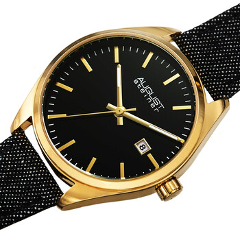 Yellow gold-tone composite metal case with a black (white dot) leather strap. Fixed yellow gold-tone composite metal bezel. Black dial with luminous yellow gold-tone pencil-style hands and index hour markers. Minute markers around the outer rim. Dial Type: Analog. Luminescent hands. Date display at the 3 o'clock position. Quartz movement. Scratch resistant mineral crystal. Pull / push crown. Solid case back. Round case shape. Case size: 38 mm. Case thickness: 10 mm. Band width: 18 mm. Band length: 7.5 inches. Tang clasp. Water resistant at 30 meters / 100 feet. Functions: date, hour, minute, second. Fashion watch style. August Steiner Quartz Black Dial Ladies Watch AS8266BK.