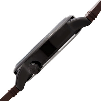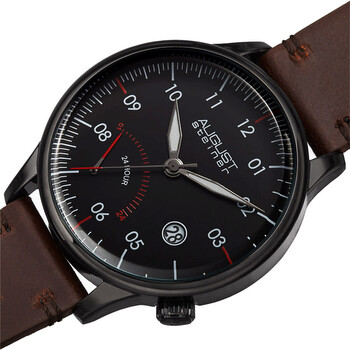 Black composite case with a brown leather strap. Fixed black bezel. Black dial with Arabic numeral hour markers. Minute markers around the outer rim. Dial Type: Analog. Date display at the 4 o'clock position. Quartz movement. Scratch resistant hardlex crystal. Pull / push crown. Solid case back. Round case shape. Case size: 42 mm. Buckle clasp. Water resistant at 30 meters / 100 feet. Functions: date, hour, minute, second. Casual watch style. August Steiner Quartz Black Dial Men's Watch AS8285BKBR.