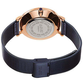 Rose gold-tone composite metal case with a blue-plated stainless steel mesh bracelet. Fixed rose gold-tone composite metal bezel. Blue dial with rose gold-tone hands and index hour markers. Minute markers around the outer rim. Dial Type: Analog. Date display at the 3 o'clock position. Quartz movement. Scratch resistant Hardlex crystal. Pull / push crown. Solid case back. Round case shape. Case size: 40 mm. Case thickness: 9 mm. Band width: 18 mm. Fold over slip through clasp. Water resistant at 30 meters / 100 feet. Functions: date, hour, minute, second. Casual watch style. August Steiner Quartz Blue Dial Men's Watch AS8283RGBU.