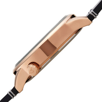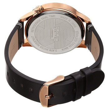 Rose gold-tone composite metal case with a black leather strap. Fixed rose gold-tone composite metal bezel. Blue dial with luminous rose gold-tone alpha-style hands and Arabic numeral hour markers. Minute markers around the outer rim. Dial Type: Analog. Luminescent hands. Date display at the 4 o'clock position. 24 hours display. Quartz movement. Scratch resistant Hardlex crystal. Pull / push crown. Solid case back. Round case shape, case size: 42 mm, case thickness: 11 mm. Band width: 20 mm. Tang clasp. Water resistant at 30 meters / 100 feet. Functions: date, hour, minute, second, dual time. Casual watch style. August Steiner Quartz Blue Dial Men's Watch AS8285RGBU.