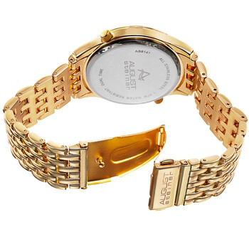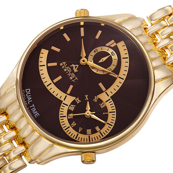 Gold-tone composite metal case with a gold-tone alloy bracelet. Fixed gold-tone composite metal bezel. Brown dial with gold-tone alpha-style shape hands and index hour markers. Minute markers around the outer rim. Dial Type: Analog. Two displays showing: small second and 12 hours. Quartz movement. Scratch resistant mineral crystal. Pull / push crown. Solid case back. Round case shape. Case size: 42 mm. Case thickness: 11 mm. Band width: 20 mm. Band length: 8.5 inches. Fold over clasp. Water resistant at 10 meters / 33 feet. Functions: second time zone, hour, minute, second. Travel watch style. August Steiner Quartz Brown Dial Men's Watch AS8141BR.