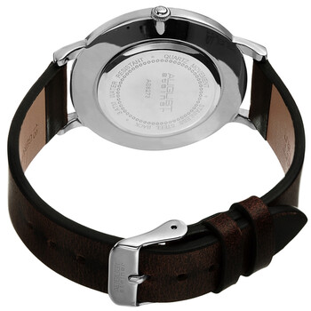 Silver-tone composite metal case with a brown leather strap. Fixed silver-tone composite metal bezel set with crystals. Blue dial with silver-tone hands and index hour markers. Minute markers around the outer rim. Dial Type: Analog. Quartz movement. Scratch resistant mineral crystal. Pull / push crown. Solid case back. Round case shape. Case size: 41 mm. Case thickness: 7 mm. Band width: 18 mm. Band length: 8.5 inches. Tang clasp. Water resistant at 30 meters / 100 feet. Functions: hour, minute. Fashion watch style. August Steiner Quartz Crystal Blue Dial Men's Watch AS8273BRBU.