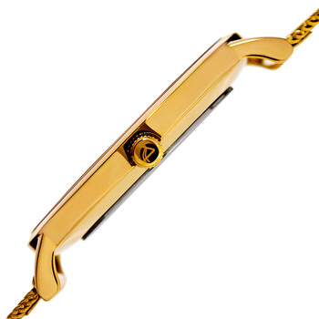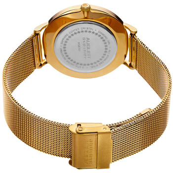 Gold-tone composite metal case with a gold-tone stainless steel mesh bracelet. Fixed gold-tone compositemetal bezel. Orange dial with gold-tone hands and index hour markers. Twin diamond set at the 12 o'clock position. Minute markers around the outer rim. Dial Type: Analog. Quartz movement. Scratch resistant mineral crystal. Pull / push crown. Solid case back. Round case shape. Case size: 38 mm. Case thickness: 6 mm. Band width: 18 mm. Band length: 7.5 inches. Fold over slip through clasp. Water resistant at 30 meters / 100 feet. Functions: hour, minute. Fashion watch style. August Steiner Quartz Diamond Orange Dial Ladies Watch AS8207YG.