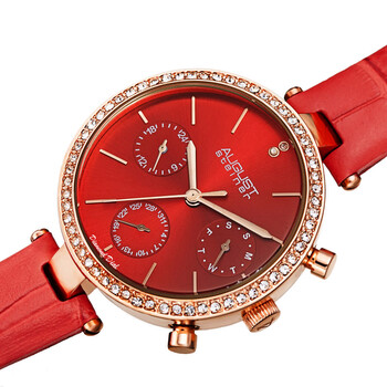 Rose gold-tone composite metal case with a red leather strap. Fixed rose gold-tone composite metal bezel set with crystals. Red dial with rose gold-tone hands and index hour markers. Twin diamonds set at the 12 o'clock position. Dial Type: Analog. Date display at the 6 o'clock position. Three multi-function sub-dials displaying: 24 hours, date and day of the week. Quartz movement. Scratch resistant Hardlex crystal. Pull / push crown. Solid case back. Round case shape. Case size: 36 mm. Case thickness: 8.5 mm. Band width: 14 mm. Band length: 7 inches. Tang clasp. Water resistant at 30 meters / 100 feet. Functions: date, day, hour, minute, second. Casual watch style. August Steiner Quartz Diamond Red Dial Ladies Watch AS8288RD.