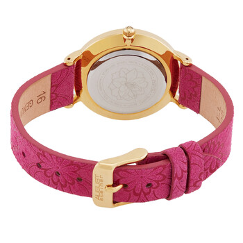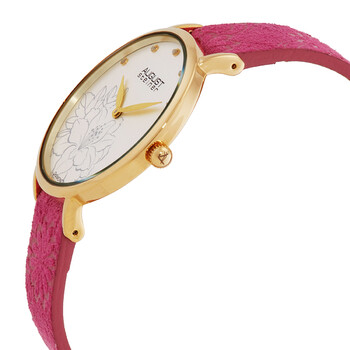 Gold-tone composite metal case with a red (floral embossed) leather strap. Fixed gold-tone composite metal bezel. Silver (flower print) dial with gold-tone leaf-style hands and diamond hour markers. Dial Type: Analog. Quartz movement. Scratch resistant mineral crystal. Pull / push crown. Solid case back. Round case shape. Case size: 36 mm. Case thickness: 7 mm. Band width: 16 mm. Band length: 7 inches. Tang clasp. Water resistant at 30 meters / 100 feet. Functions: hour, minute. Fashion watch style. August Steiner Quartz Diamond Silver Dial Ladies Watch AS8242PK.