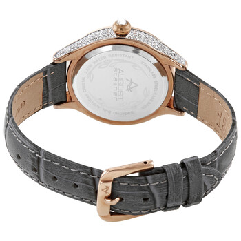 Rose gold-tone alloy case with a grey leather strap. Fixed rose gold-tone alloy bezel set with crystals. White mother of pearl dial with luminous rose gold-tone hands and diamond hour markers. Roman numerals appear at the 3, 6, 9 and 12 o'clock positions. Dial Type: Analog. Luminescent hands. Quartz movement. Scratch resistant mineral crystal. Pull / push crown. Solid case back. Round case shape. Case size: 36 mm. Case thickness: 10 mm. Band width: 16 mm. Tang clasp. Water resistant at 30 meters / 100 feet. Functions: hour, minute, second. Dress watch style. August Steiner Quartz Diamond White MOP Dial Ladies AS8188GY.