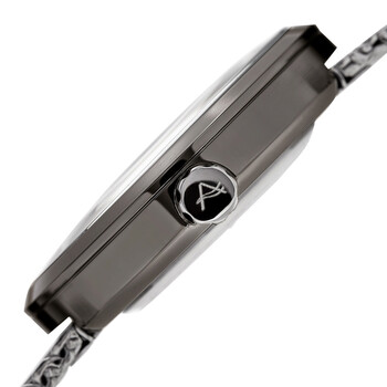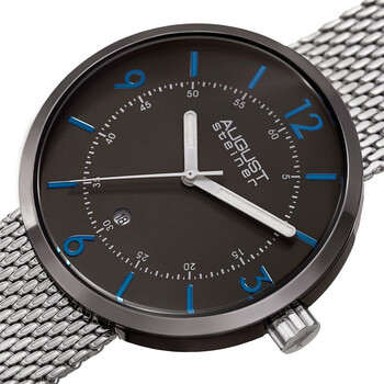 Grey-plated composite metal case with a silver-tone stainless steel mesh bracelet. Fixed grey-plated composite metal bezel. Grey dial with luminous silver-tone hands and index hour markers. Arabic numerals appear at the 3, 6, 9 and 12 o'clock positions. Arabic numeral minute markers (at 5 minute intervals). Minute markers around an inner ring. Dial Type: Analog. Luminescent hands and markers. Date display at the 6 o'clock position. Quartz movement. Scratch resistant mineral crystal. Pull / push crown. Solid case back. Round case shape. Case size: 42 mm. Case thickness: 12 mm. Band width: 22 mm. Band length: 7.5 inches. Fold over slip through clasp. Water resistant at 30 meters / 100 feet. Functions: date, hour, minute, second. Fashion watch style. August Steiner Quartz Grey Dial Silver-tone Mesh Men's Watch AS8204SSGN.