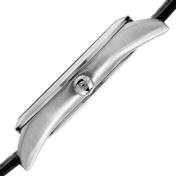 Silver-tone composite metal case with a black leather strap. Fixed silver-tone composite metal bezel. Silver dial with blue leaf-style hands and index hour markers. Minute markers around the outer rim. Dial Type: Analog. Three multi-function sub-dials displaying: date, day of the week and 24 hour. Quartz movement. Scratch resistant mineral crystal. Pull / push crown. Solid case back. Round case shape. Case size: 44 mm. Case thickness: 9.5 mm. Band width: 22 mm. Band length: 7.5 inches. Tang clasp. Water resistant at 30 meters / 100 feet. Functions: date, day, GMT, second time zone, hour, minute, second. Fashion watch style. August Steiner Quartz Silver Dial Black Leather Men's Watch AS8243SSBK.