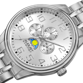 Silver-tone composite metal case with a silver-tone alloy bracelet. Fixed silver-tone composite metal bezel. Silver dial with luminous silver-tone dauphine-style hands and Arabic numeral hour markers. Minute markers around the outer rim. Dial Type: Analog. Luminescent hands. Four multi-function sub-dials displaying: day of the week, date, month and moonphase. Quartz movement. Scratch resistant mineral crystal. Pull / push crown. Solid case back. Round case shape. Case size: 45 mm. Case thickness: 10 mm. Band width: 22 mm. Band length: 8 inches. Fold over clasp. Water resistant at 10 meters / 33 feet. Functions: month, moonphase, date, day, hour, minute, second. Fashion watch style. August Steiner Quartz Silver Dial Men's Watch AS8174SS.