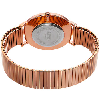 Rose gold-tone alloy case with a rose gold-tone stainless steel expansion bracelet. Fixed rose gold-tone alloy bezel. Silver dial with rose gold-tone hands and index hour markers. Minute markers around the outer rim. Dial Type: Analog. Quartz movement. Scratch resistant sapphire-coated mineral crystal. Pull / push crown. Solid case back. Round case shape. Case size: 40 mm. Case thickness: 7 mm. Bracelet width: 20 mm. Water resistant at 30 meters / 100 feet. Functions: hour, minute. Casual watch style. Watch label: Japan Movt. August Steiner Quartz Silver Dial Men's Watch AS8216RG.