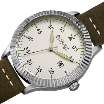 Silver-tone composite metal case with a green leather strap. Fixed fluted silver-tone composite metal bezel. Silver dial with luminous silver-tone sword-shaped hands and index hour markers. Arabic numeral minute markers (at 5 minute intervals). Minute markers around the outer rim. Dial Type: Analog. Luminescent hands and markers. Date display at the 3 o'clock position. Quartz movement. Scratch resistant mineral crystal. Pull / push crown. Solid case back. Round case shape. Case size: 42 mm. Case thickness: 11 mm. Band width: 20 mm. Band length: 8.5 inches. Tang clasp. Water resistant at 30 meters / 100 feet. Functions: date, hour, minute, second. Fashion watch style. August Steiner Quartz Silver Dial Men's Watch AS8272GN.