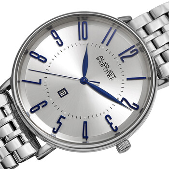Stainless steel case with a stainless steel bracelet. Fixed stainless steel bezel. White dial with blue leaf-style hands and Arabic numeral hour markers. Minute markers around an inner ring. Dial Type: Analog. Date display above the 6 o'clock position. Quartz movement. Scratch resistant mineral crystal. Pull / push crown. Solid case back. Round case shape. Case size: 40 mm. Case thickness: 9.7 mm. Band width: 22 mm. Band length: 8 inches. Butterfly clasp. Water resistant at 30 meters / 100 feet. Functions: date, hour, minute, second. Fashion watch style. August Steiner Quartz White Dial Men's Watch AS8257SS.