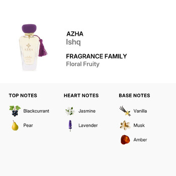 Ishq opens with a bright and juicy blend of blackcurrant and pear, creating a sweet and refreshing introduction that's impossible to ignore. As the fragrance unfolds, delicate heart notes of jasmine and lavender add a graceful floral warmth, evoking a sense of romance and serenity. Finally, the scent settles into a luxurious base of vanilla, musk, and amber, providing a soft, sensual finish that lingers on the skin throughout the day.