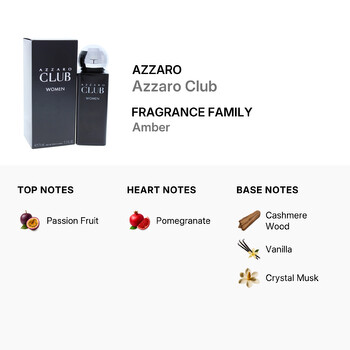 Belonging to the Amber fragrance family, Azzaro Club opens with a burst of exotic passion fruit, creating a sweet and energetic first impression. As the scent unfolds, juicy pomegranate adds a layer of playful depth, while the base of smooth cashmere wood, creamy vanilla, and glowing crystal musk delivers an unforgettable, velvety finish.