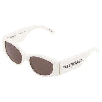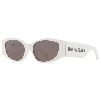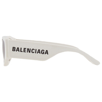 Balenciaga Sunglasses. Series number: BB0258S. Color code: 012. Shape: Irregular. Lens Width: 56 mm. Lens Bridge: 18 mm. Arm Length: 145 mm. 100% UV protection. Non-Polarized. Frame Material: Recycled Acetate. Frame Color: White. Lenses Type: Grey. Rim Style: Full-Rim. UPC/EAN code: 889652445250. Balenciaga Grey Irregular Ladies Sunglasses BB0258S 012 56.