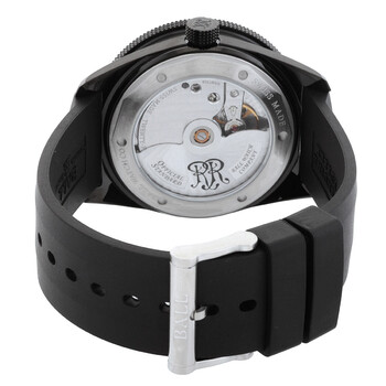 Black PVD case with a black rubber strap. Uni-directional rotating black titanium carbide coating bezel. Black dial with silver-tone hands and index hour markers. Minute scale around the inner rim. Dial Type: Analog. Luminescent hands and markers. Date display at the 3 o'clock position. Ball Calibre RRM7309-C Automatic movement, containing 25 Jewels, bitting at 28800 vph, and has a power reserve of approximately 80 hours. Scratch resistant sapphire crystal. Screw down crown. Transparent see through case back. Round case shape, case size: 42 mm, case thickness: 15.2 mm. Buckle clasp. Water resistant at 200 meters / 660 feet. Functions: date, hour, minute, second. Engineer II Series. Sport watch style. Watch label: Swiss Made. Ball Engineer II Automatic Black Dial Men's Watch DD3208B-P2C-BK.